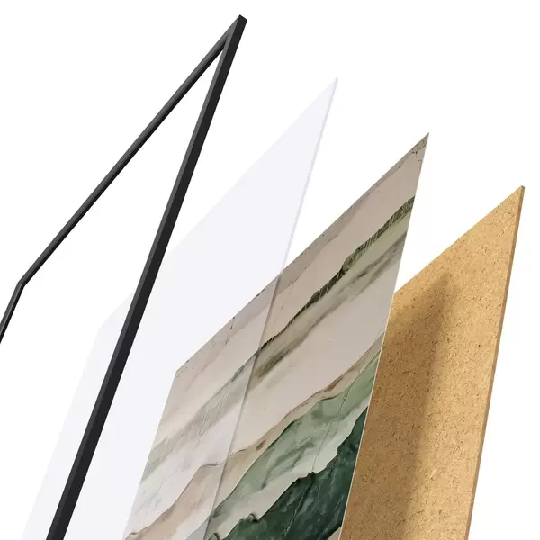 De poster bestaat uit een frame, plexiglas, geprinte afbeelding en spaanplaat achterkant. De poster kan meteen aan de muur worden gehangen dankzij de bevestigingen op de achterkant.