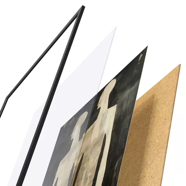 De poster bestaat uit een frame, plexiglas, geprinte afbeelding en spaanplaat achterkant. De poster kan meteen aan de muur worden gehangen dankzij de bevestigingen op de achterkant.
