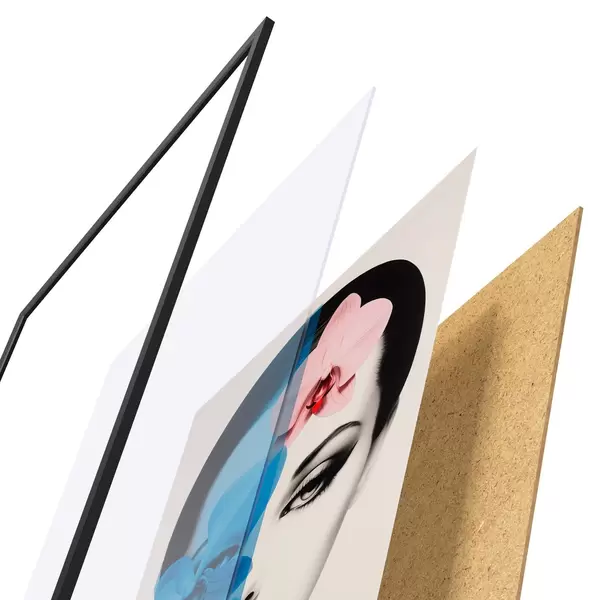 De poster bestaat uit een frame, plexiglas, geprinte afbeelding en spaanplaat achterkant. De poster kan meteen aan de muur worden gehangen dankzij de bevestigingen op de achterkant.