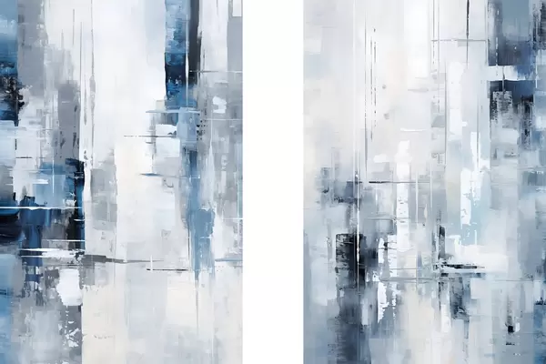 Poster Abstracte schilderijimitatie met blauwe, grijze en witte kleuren, verticale lijnen en geometrische vormen Nr d00819