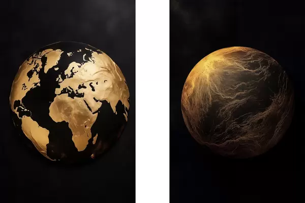 Poster Geabstraheerde wereldbol en planeet met textuur op een zwarte achtergrond, moderne minimalistische kunst d00827