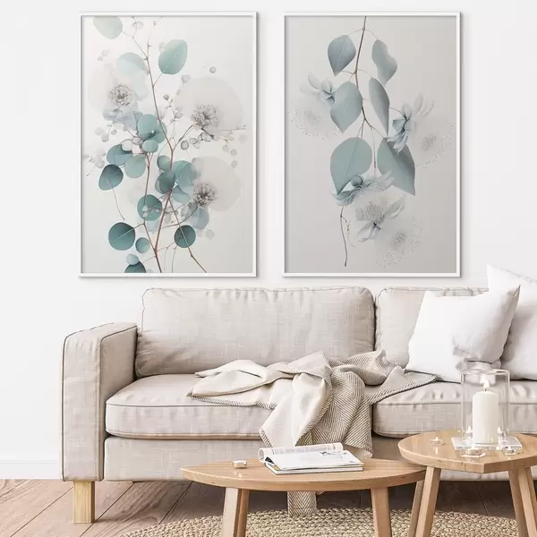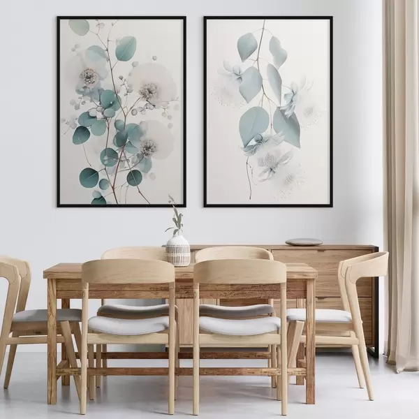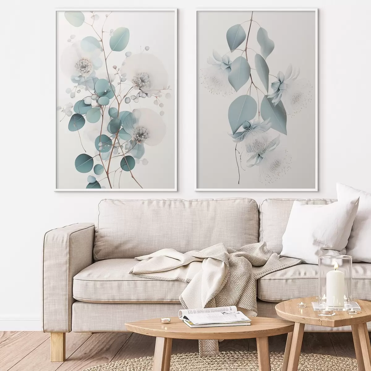 Poster Eucalyptustak met blauwe bladeren en witte bloemen, lichte achtergrond Nr d00829