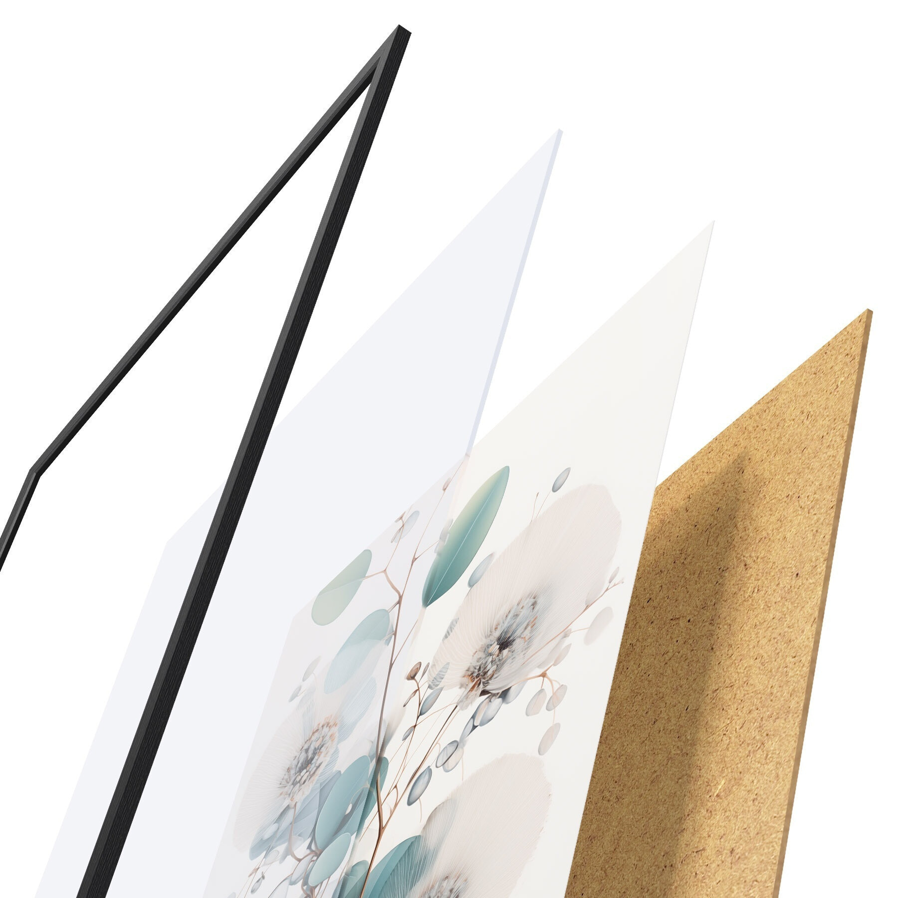 De poster bestaat uit een frame, plexiglas, geprinte afbeelding en spaanplaat achterkant. De poster kan meteen aan de muur worden gehangen dankzij de bevestigingen op de achterkant.