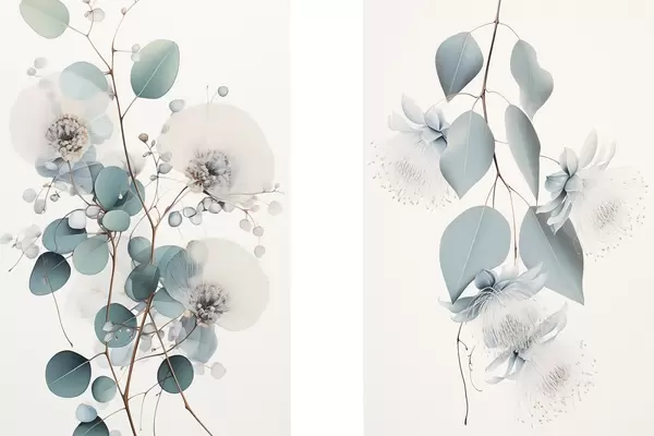 Poster Eucalyptustak met blauwe bladeren en witte bloemen, lichte achtergrond Nr d00829