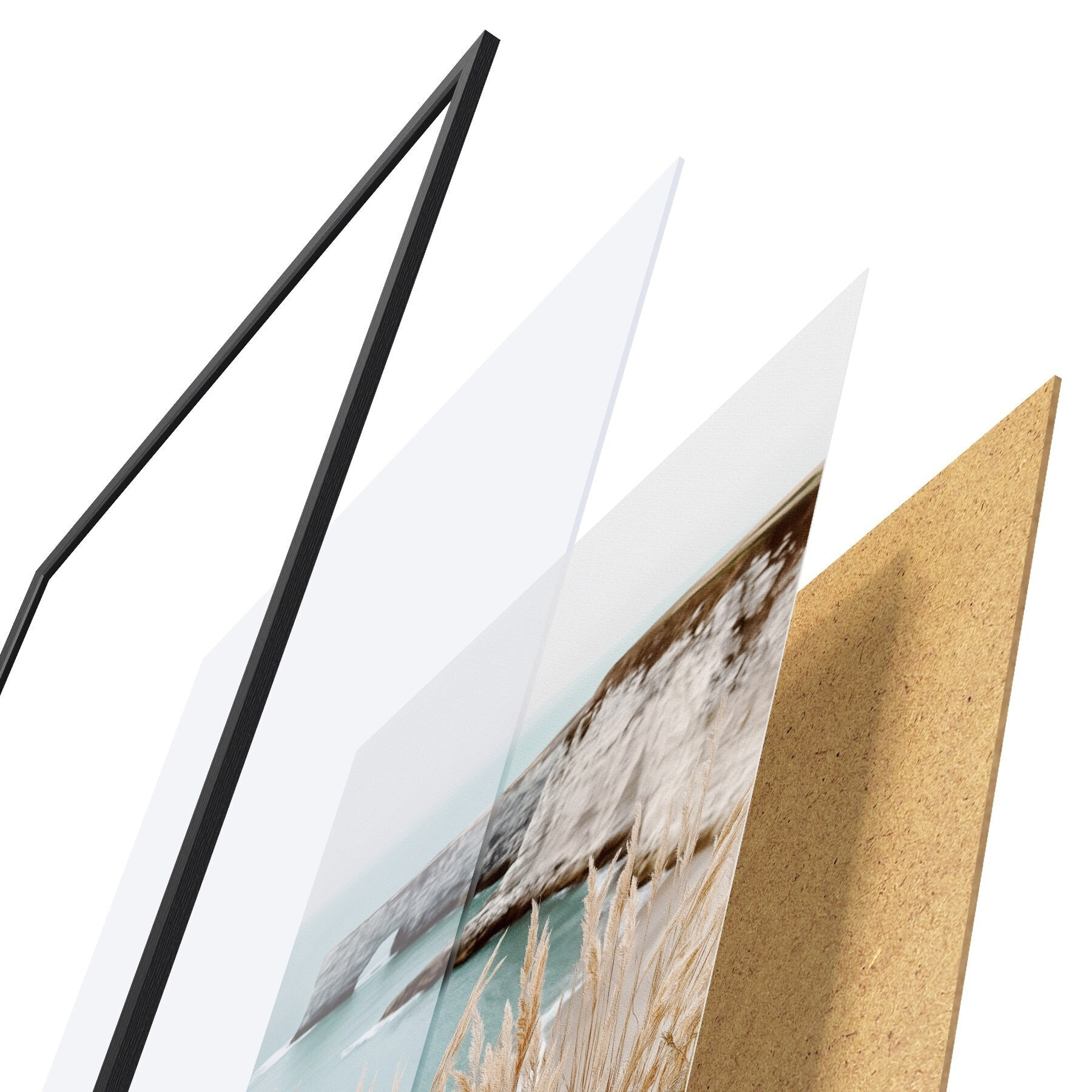 De poster bestaat uit een frame, plexiglas, geprinte afbeelding en spaanplaat achterkant. De poster kan meteen aan de muur worden gehangen dankzij de bevestigingen op de achterkant.