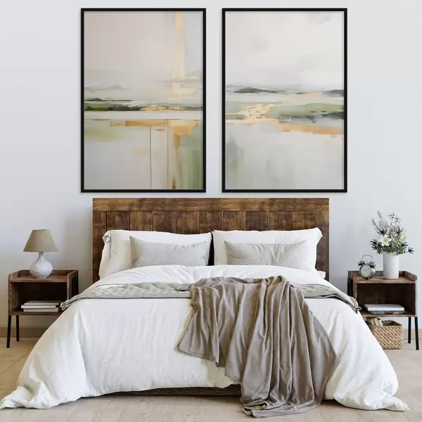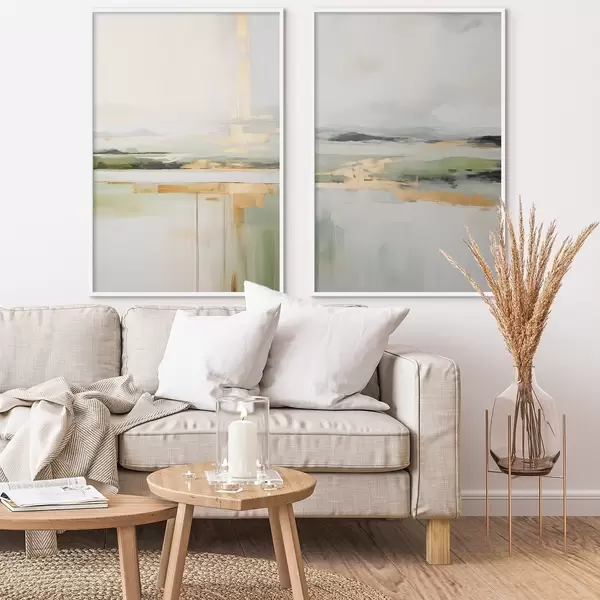 Poster Abstract landschap met gele accenten, een minimalistische compositie van land, water en lucht, met gedempte kleuren Nr d00877