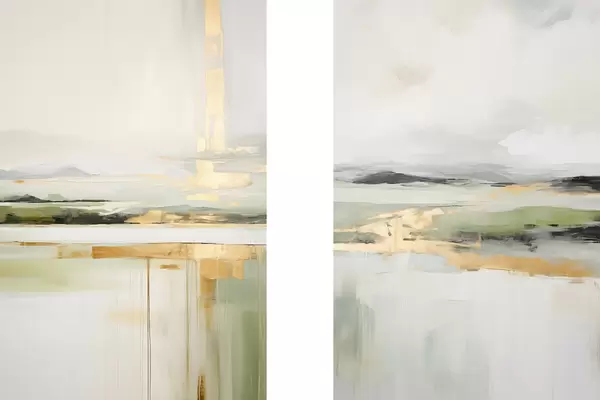 Poster Abstract landschap met gele accenten, een minimalistische compositie van land, water en lucht, met gedempte kleuren Nr d00877