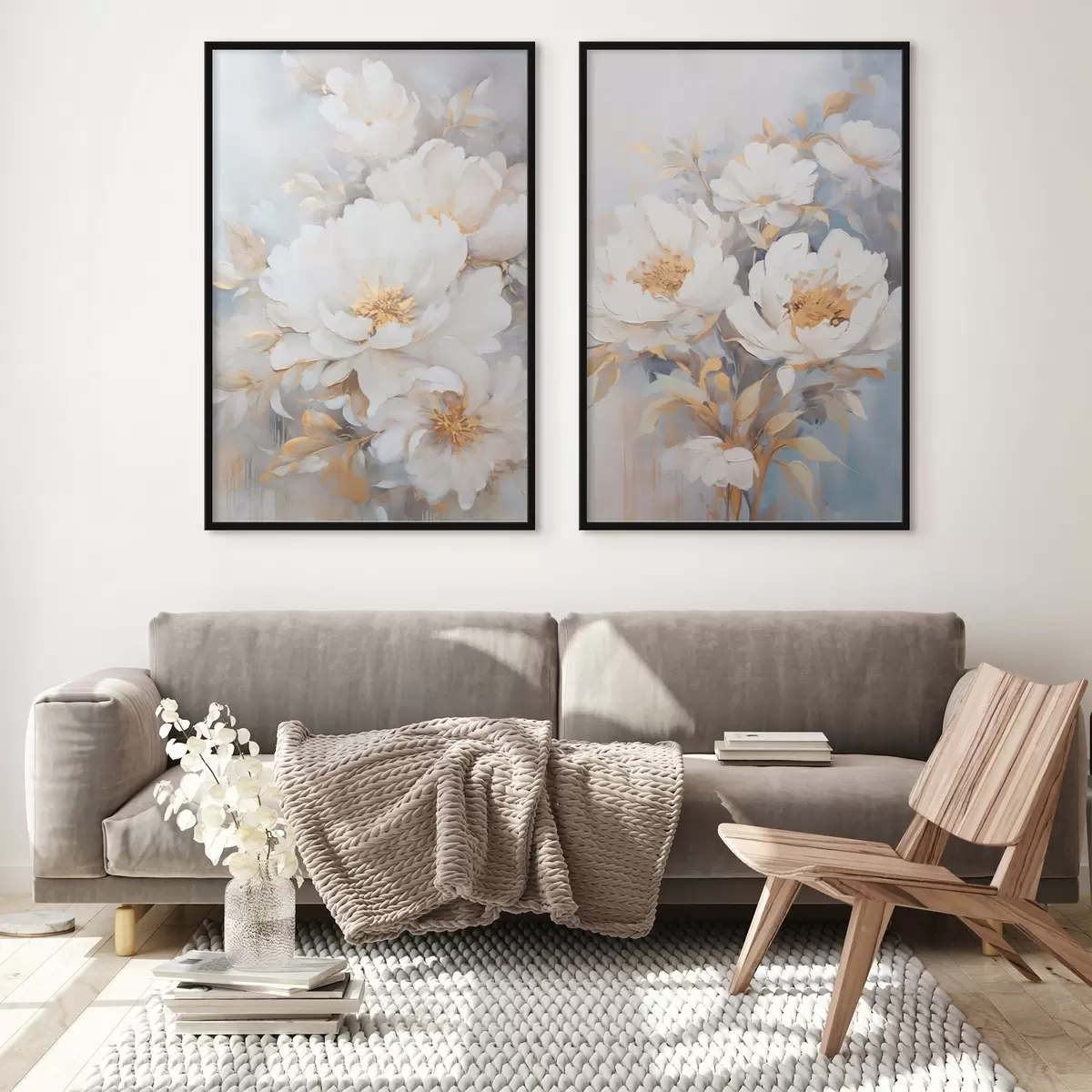 Poster Witte pioenrozen met gele hartjes en bladeren, zachte penseelstreken, lichtblauwe achtergrond, bloemstuk Nr d00878