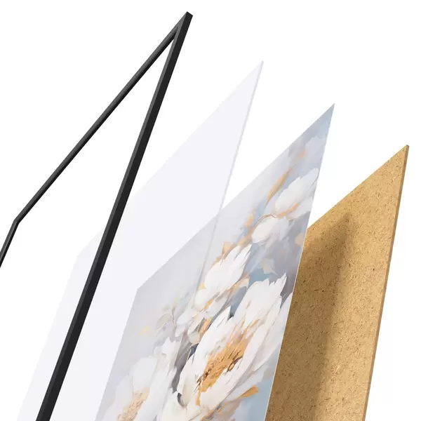 De poster bestaat uit een frame, plexiglas, geprinte afbeelding en spaanplaat achterkant. De poster kan meteen aan de muur worden gehangen dankzij de bevestigingen op de achterkant.