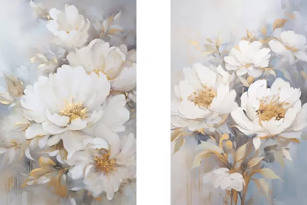 Poster Witte pioenrozen met gele hartjes en bladeren, zachte penseelstreken, lichtblauwe achtergrond, bloemstuk Nr d00878