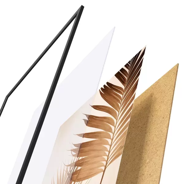 De poster bestaat uit een frame, plexiglas, geprinte afbeelding en spaanplaat achterkant. De poster kan meteen aan de muur worden gehangen dankzij de bevestigingen op de achterkant.
