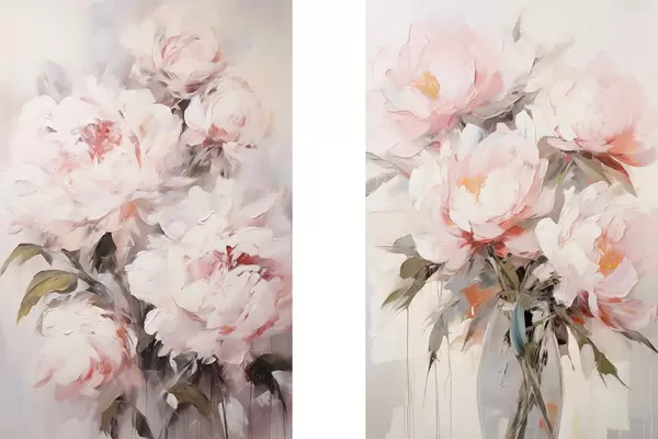 Poster Een boeket lichtroze pioenrozen met groene bladeren, zachte penseelstreken, pastelkleuren, op een lichte achtergrond Nr d00890