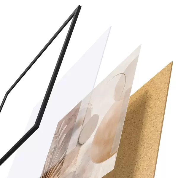 De poster bestaat uit een frame, plexiglas, geprinte afbeelding en spaanplaat achterkant. De poster kan meteen aan de muur worden gehangen dankzij de bevestigingen op de achterkant.