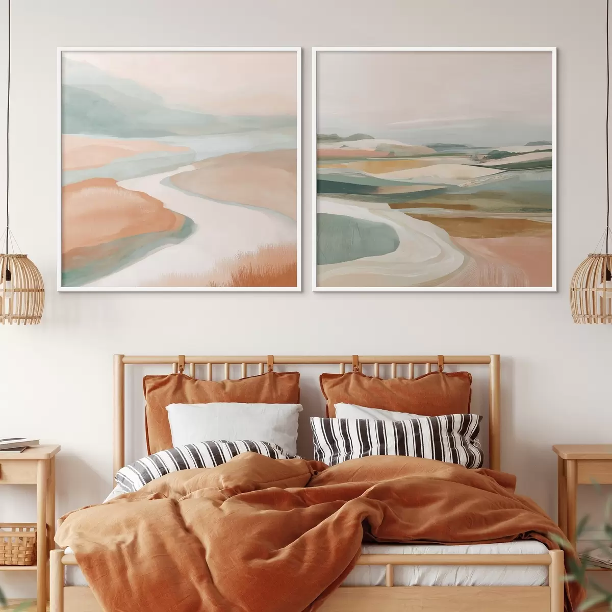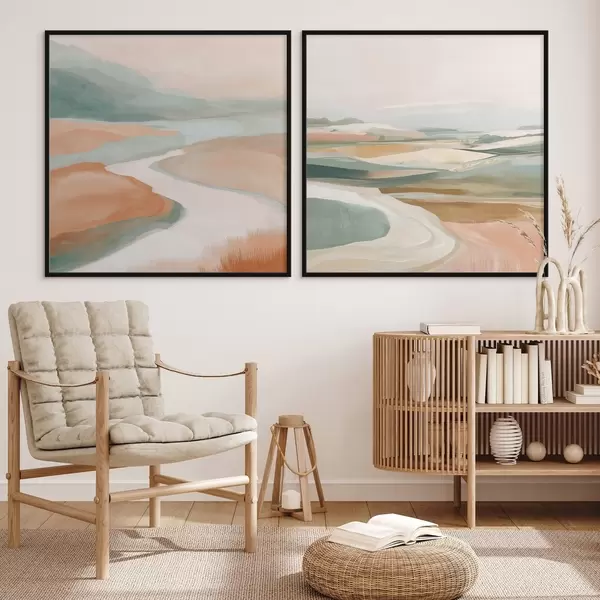 Poster Abstracte heuvels en rivier in pastelkleuren Nr d00896