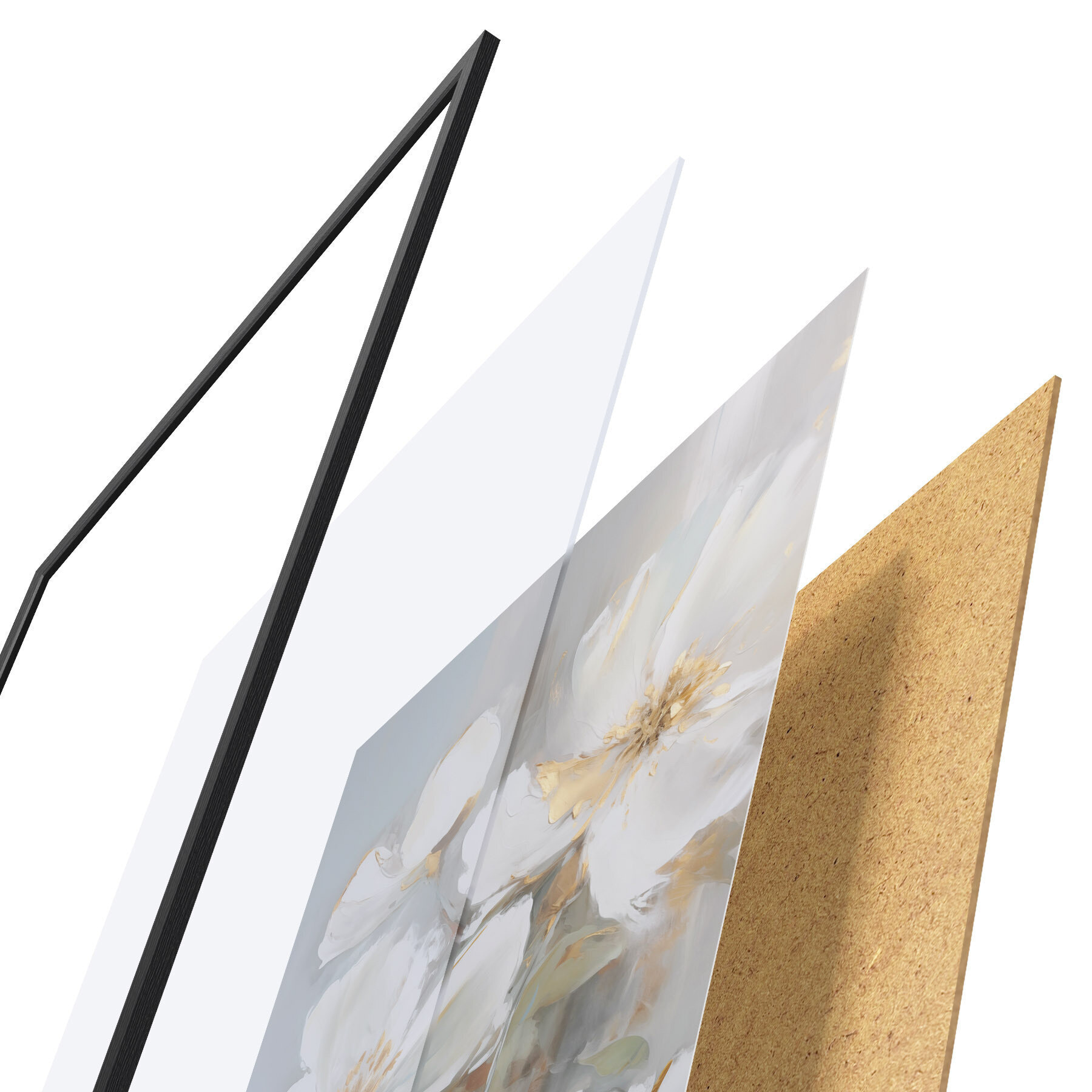 De poster bestaat uit een frame, plexiglas, geprinte afbeelding en spaanplaat achterkant. De poster kan meteen aan de muur worden gehangen dankzij de bevestigingen op de achterkant.