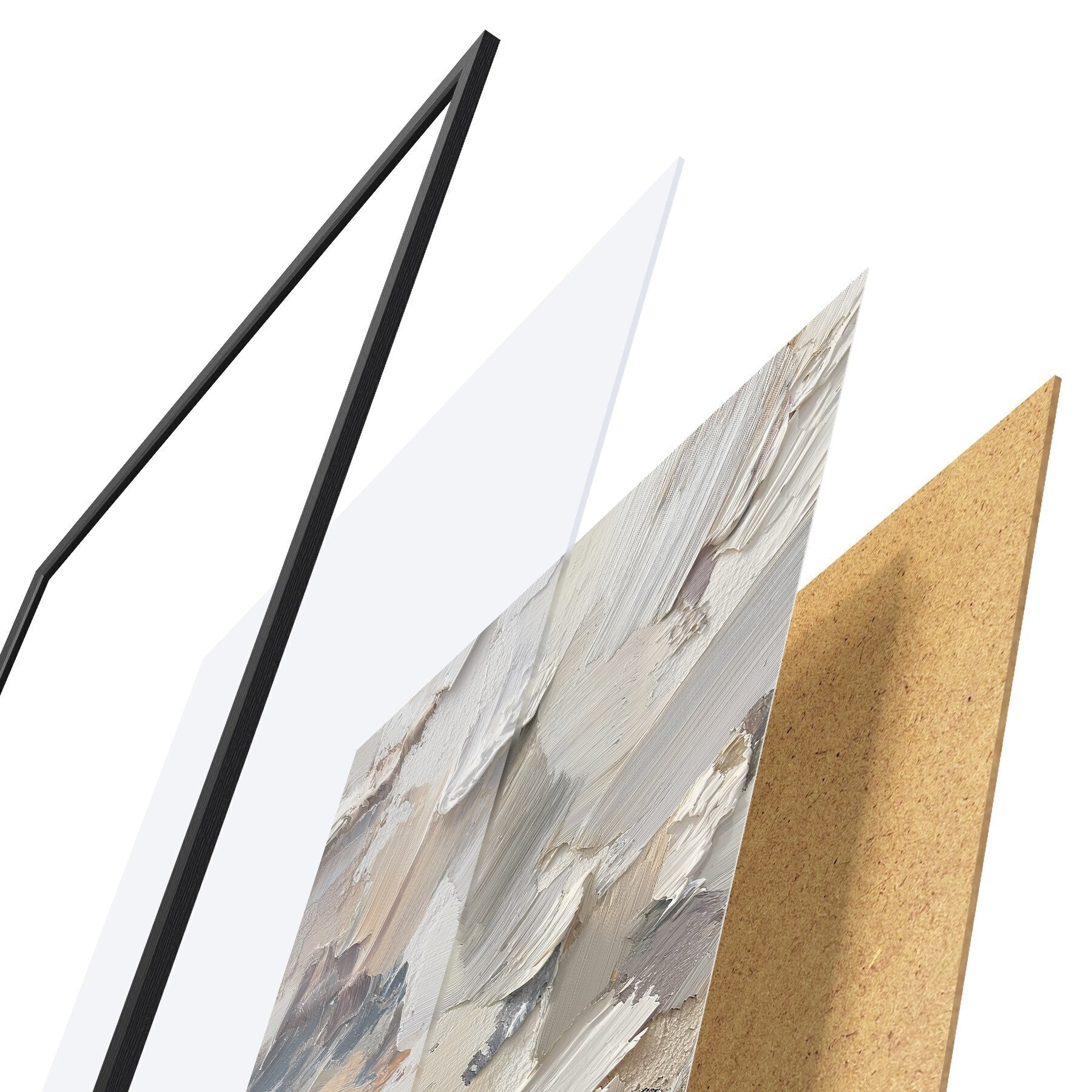 De poster bestaat uit een frame, plexiglas, geprinte afbeelding en spaanplaat achterkant. De poster kan meteen aan de muur worden gehangen dankzij de bevestigingen op de achterkant.
