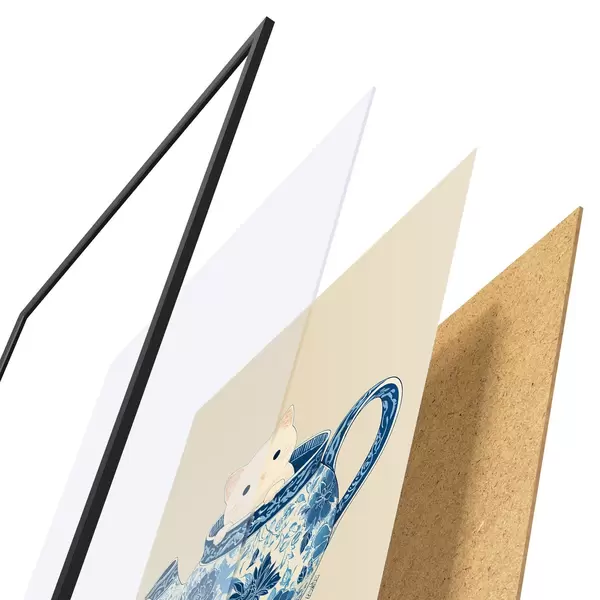 De poster bestaat uit een frame, plexiglas, geprinte afbeelding en spaanplaat achterkant. De poster kan meteen aan de muur worden gehangen dankzij de bevestigingen op de achterkant.
