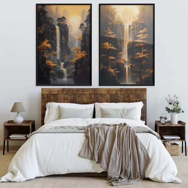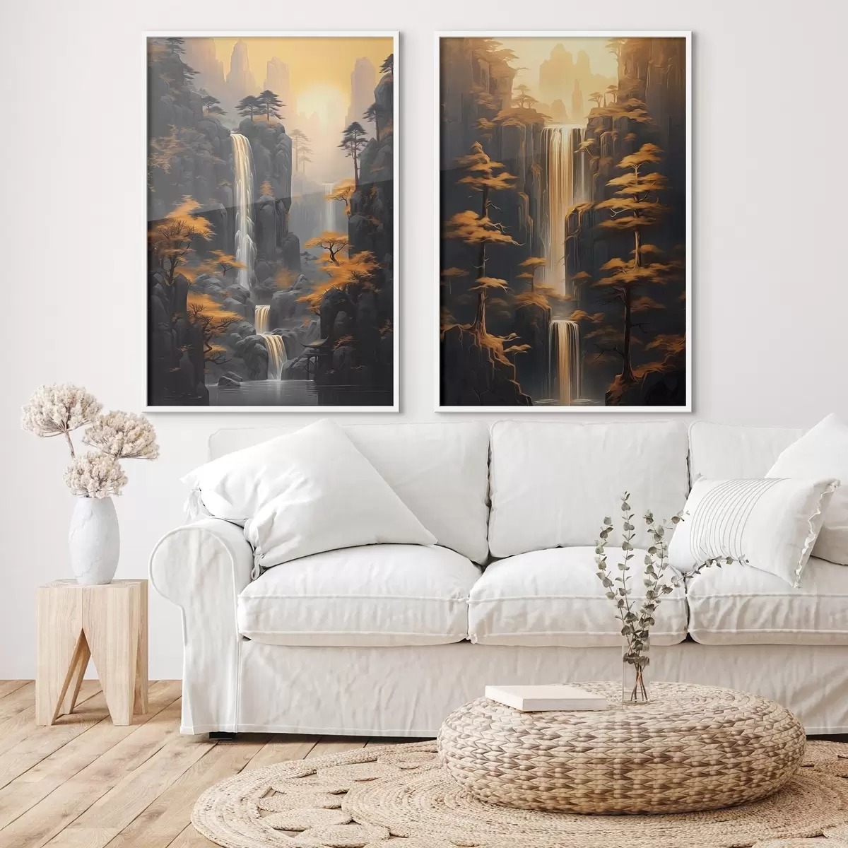 Poster Landschap met waterval en bergen in gouden licht Nr d00928