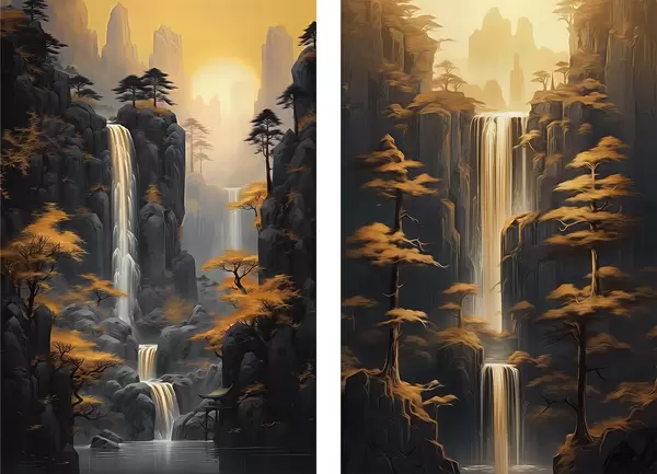 Poster Landschap met waterval en bergen in gouden licht Nr d00928