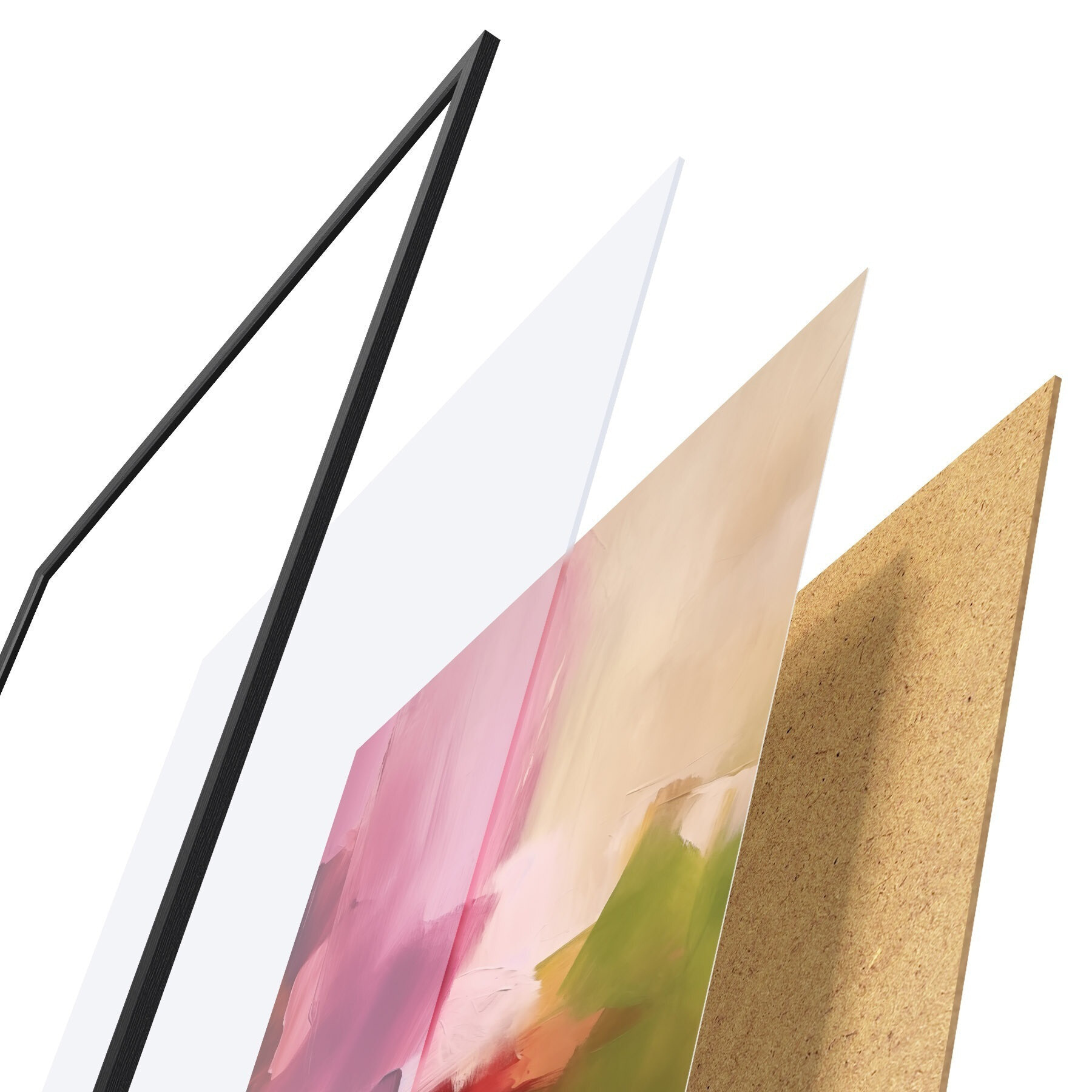 De poster bestaat uit een frame, plexiglas, geprinte afbeelding en spaanplaat achterkant. De poster kan meteen aan de muur worden gehangen dankzij de bevestigingen op de achterkant.