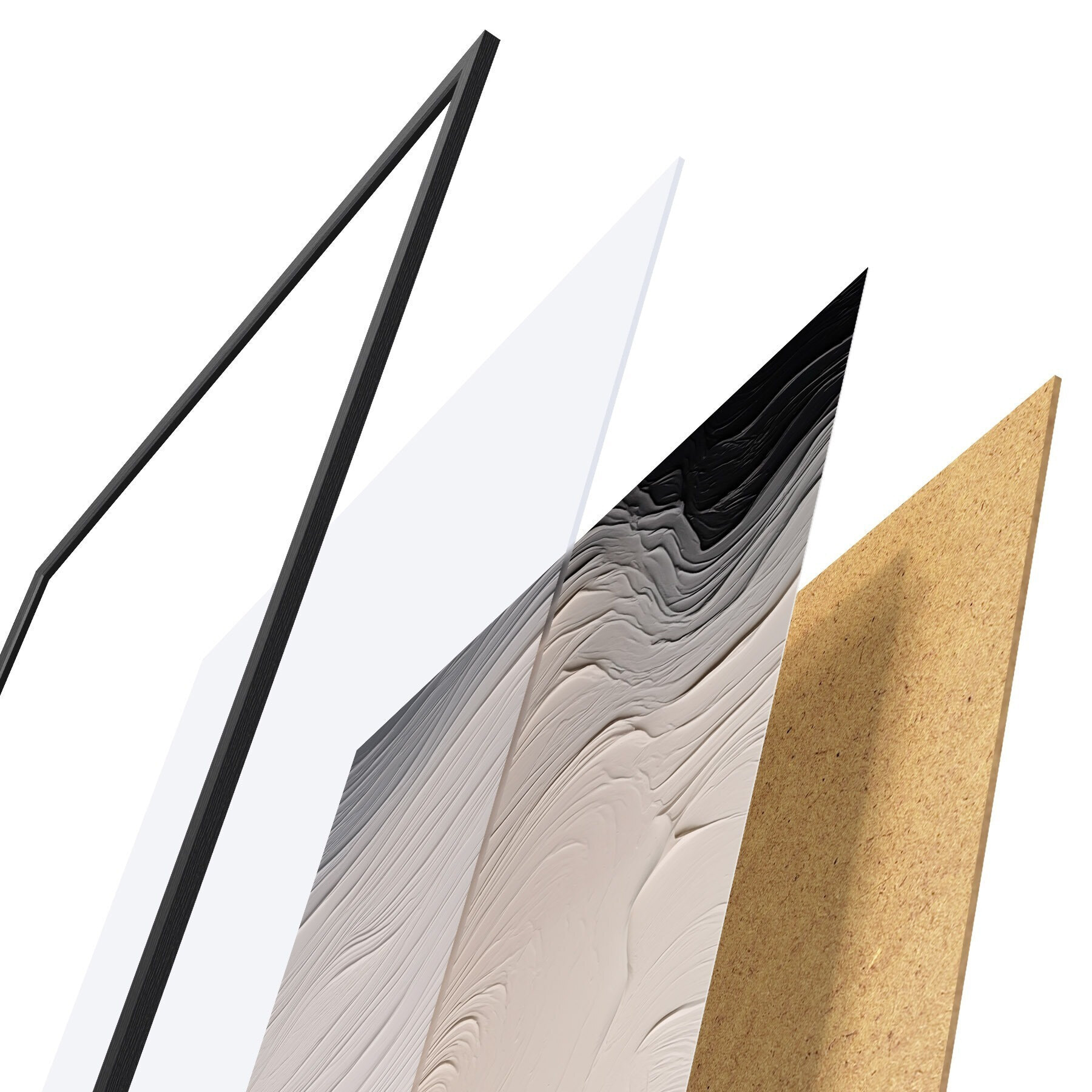 De poster bestaat uit een frame, plexiglas, geprinte afbeelding en spaanplaat achterkant. De poster kan meteen aan de muur worden gehangen dankzij de bevestigingen op de achterkant.