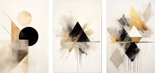 Poster Geometrische driehoeken met inktvlekken, zwart en oker Nr d00963
