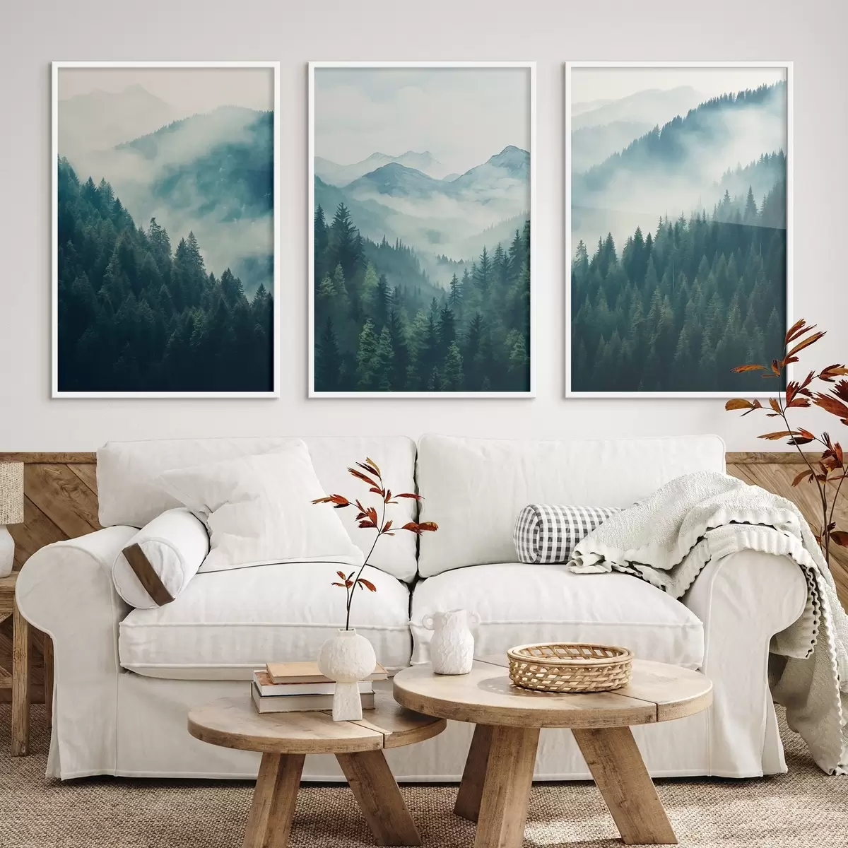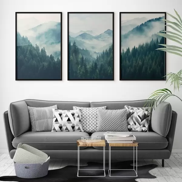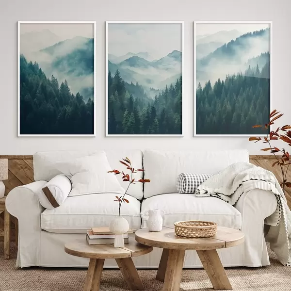 Poster Mistige dennenbergen gehuld in zachte groene en blauwe tinten Nr d00964