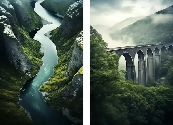 Poster Luchtfoto van een rivierkloof en een mistig viaduct in groene heuvels Nr d00967