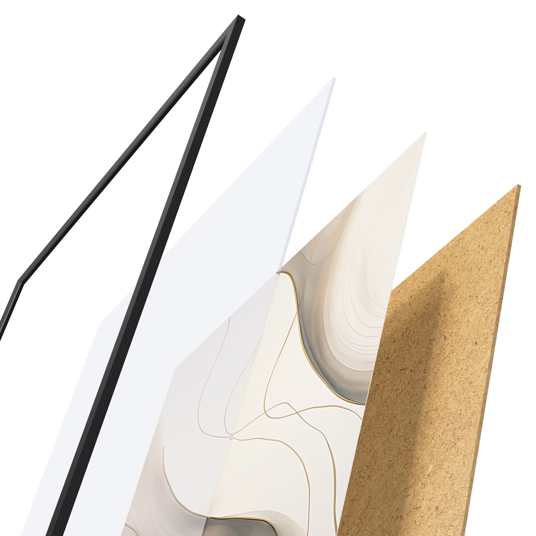 De poster bestaat uit een frame, plexiglas, geprinte afbeelding en spaanplaat achterkant. De poster kan meteen aan de muur worden gehangen dankzij de bevestigingen op de achterkant.