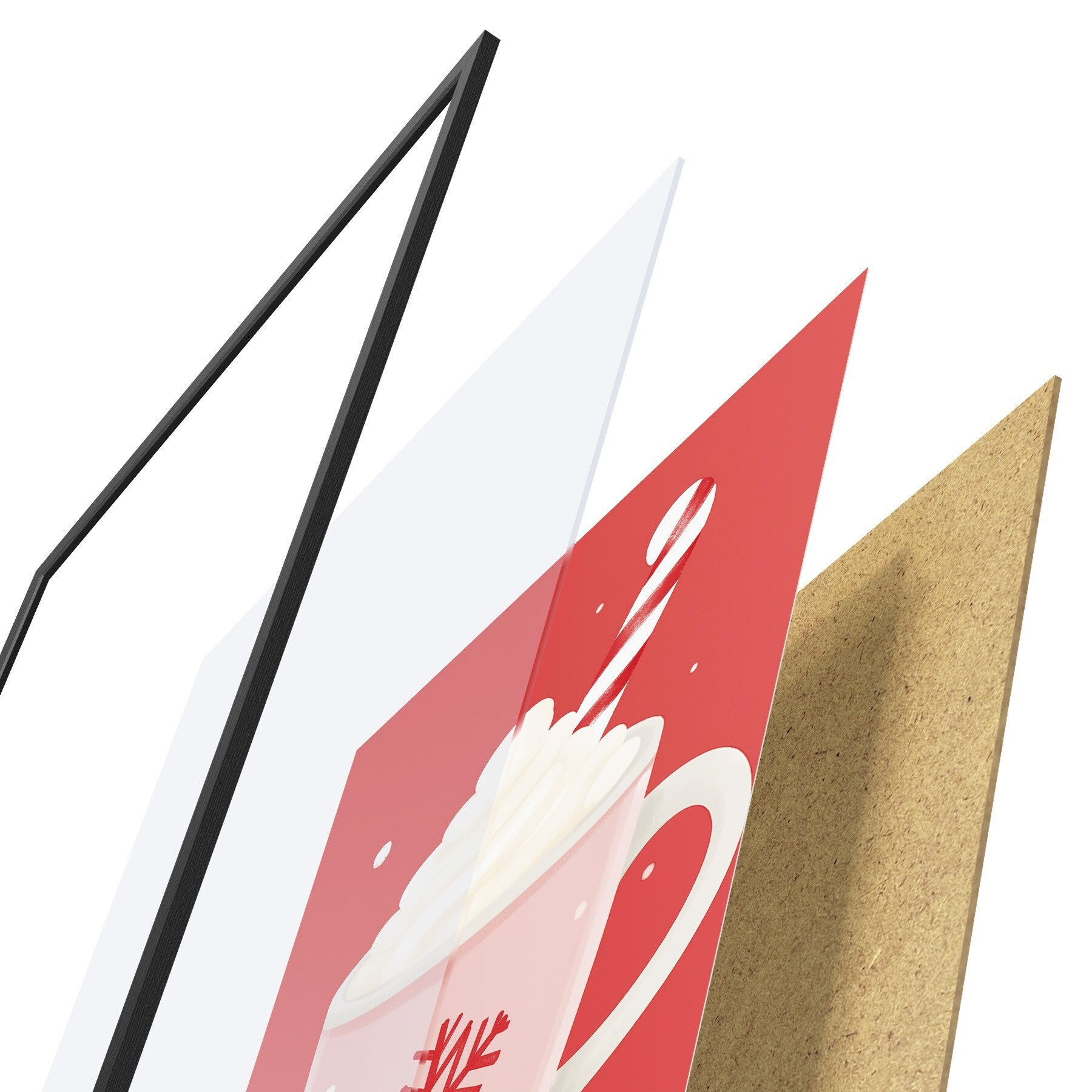 De poster bestaat uit een frame, plexiglas, geprinte afbeelding en spaanplaat achterkant. De poster kan meteen aan de muur worden gehangen dankzij de bevestigingen op de achterkant.