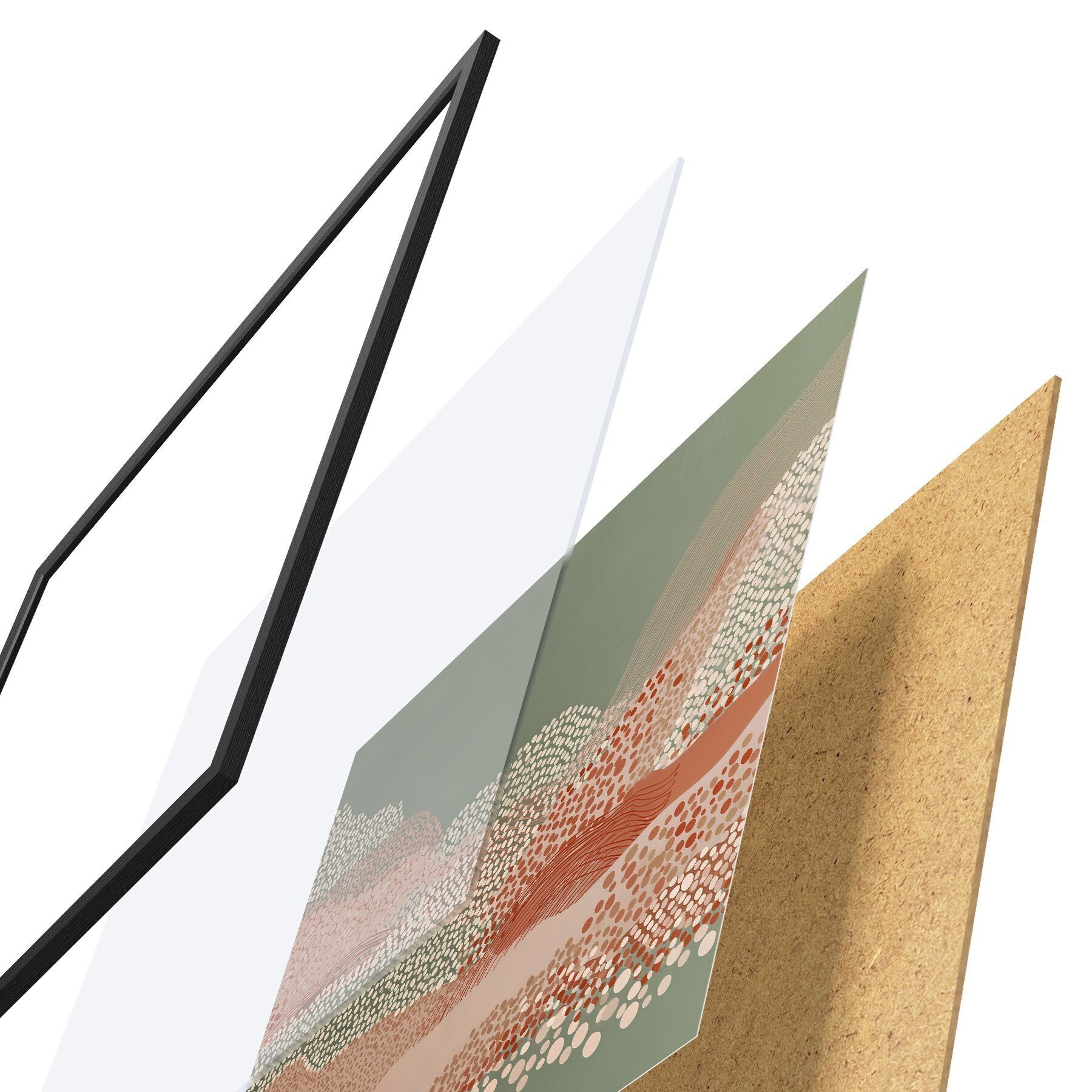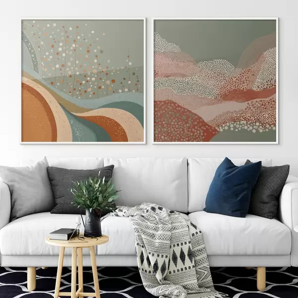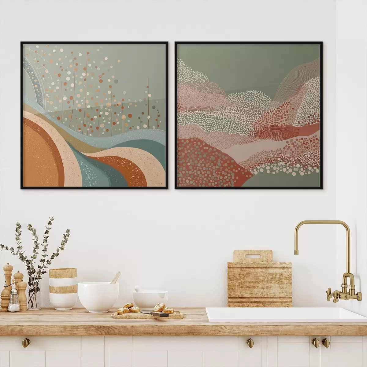 Poster Tweedelig abstract landschap met gestippelde en golvende elementen Nr d00987