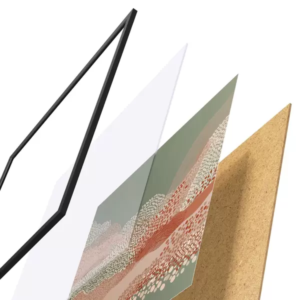 De poster bestaat uit een frame, plexiglas, geprinte afbeelding en spaanplaat achterkant. De poster kan meteen aan de muur worden gehangen dankzij de bevestigingen op de achterkant.