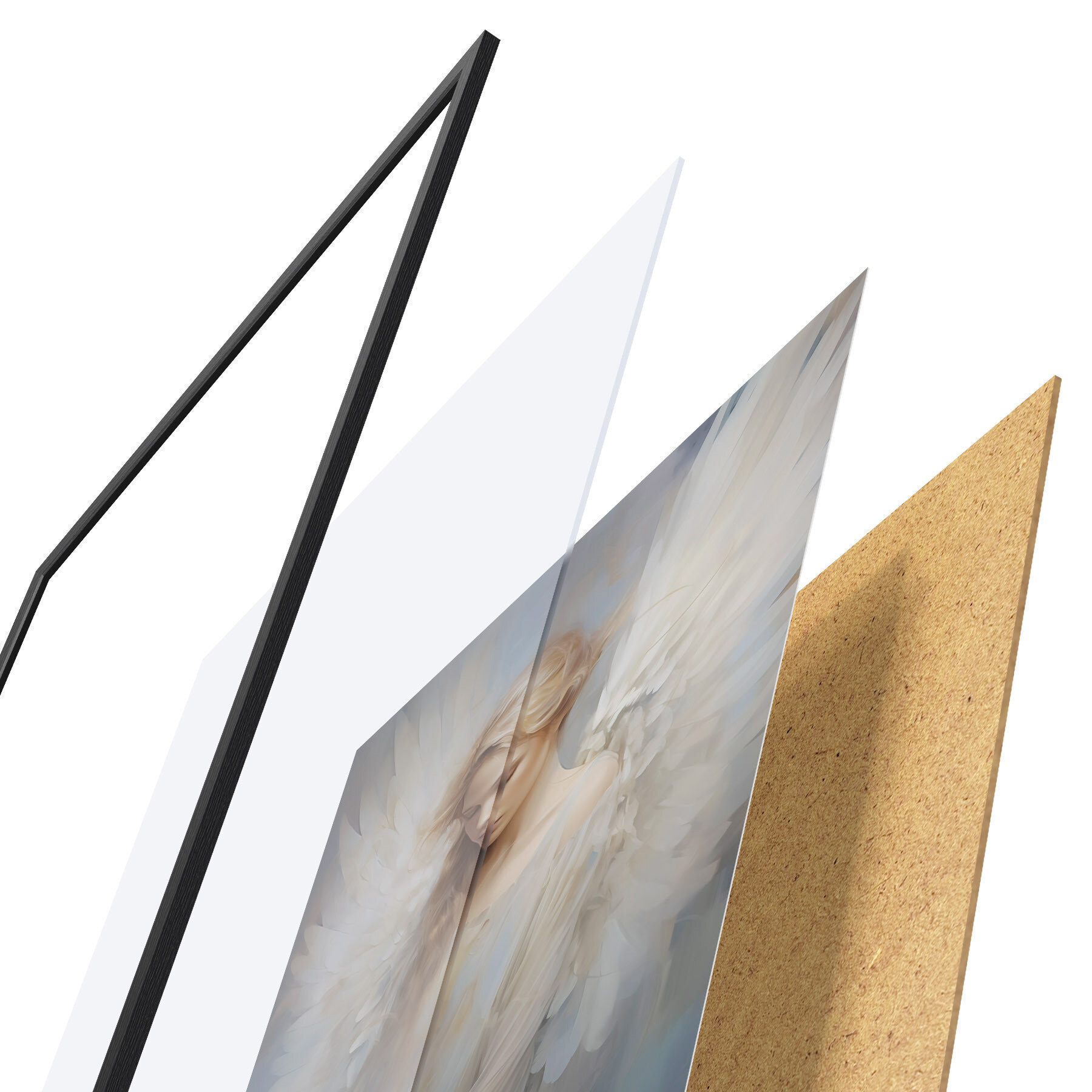 De poster bestaat uit een frame, plexiglas, geprinte afbeelding en spaanplaat achterkant. De poster kan meteen aan de muur worden gehangen dankzij de bevestigingen op de achterkant.
