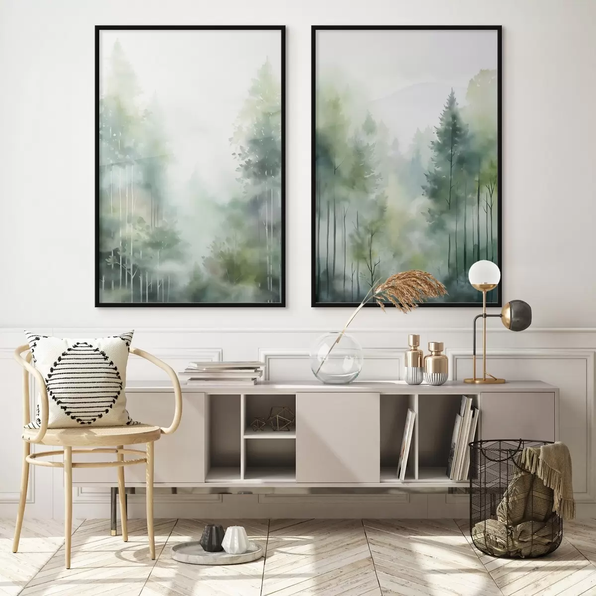 Poster Aquarelschilderij imitatie van abstract bos met hoge bomen en groen gebladerte, zachte gedempte kleuren d01005