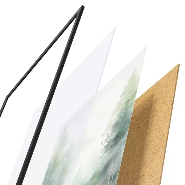 De poster bestaat uit een frame, plexiglas, geprinte afbeelding en spaanplaat achterkant. De poster kan meteen aan de muur worden gehangen dankzij de bevestigingen op de achterkant.