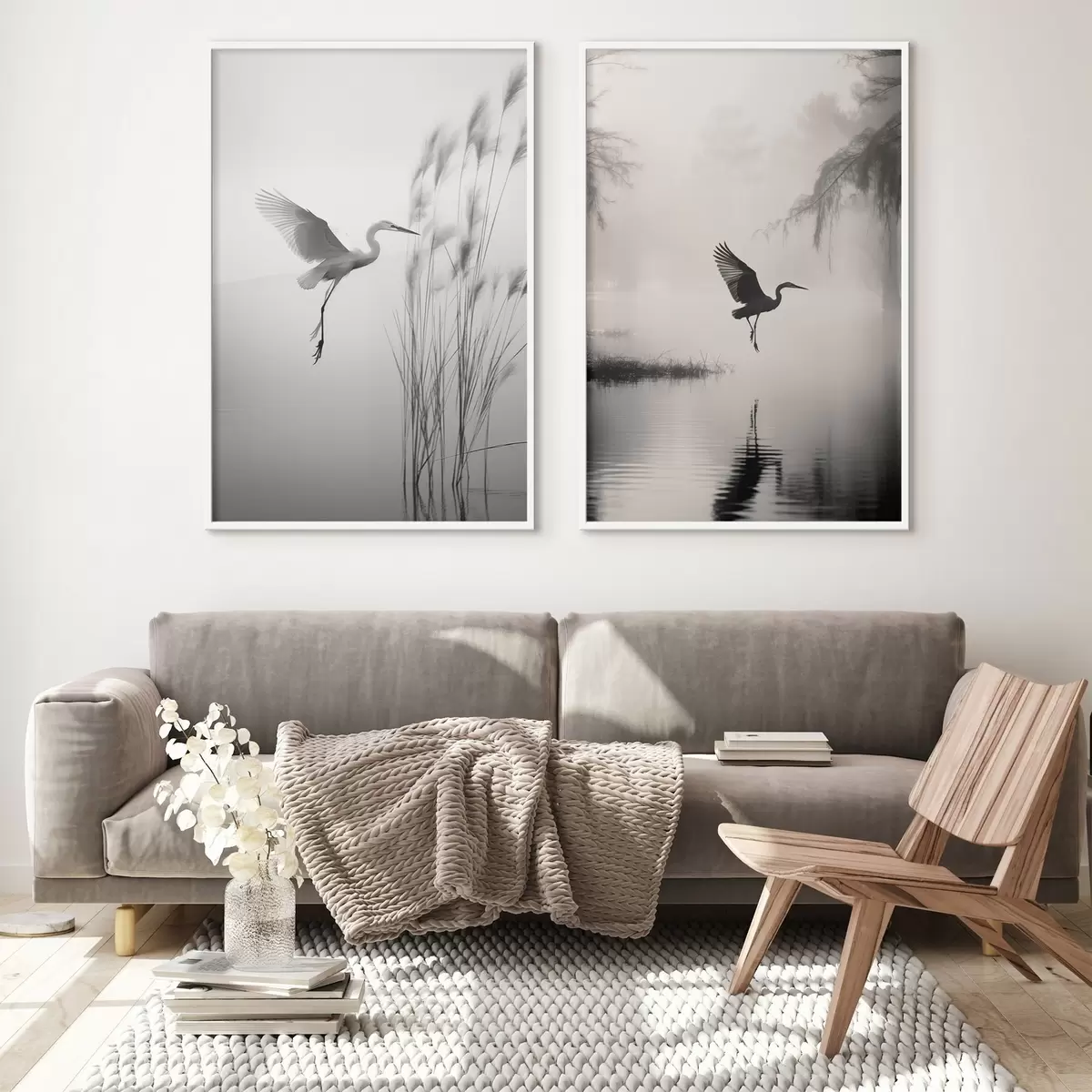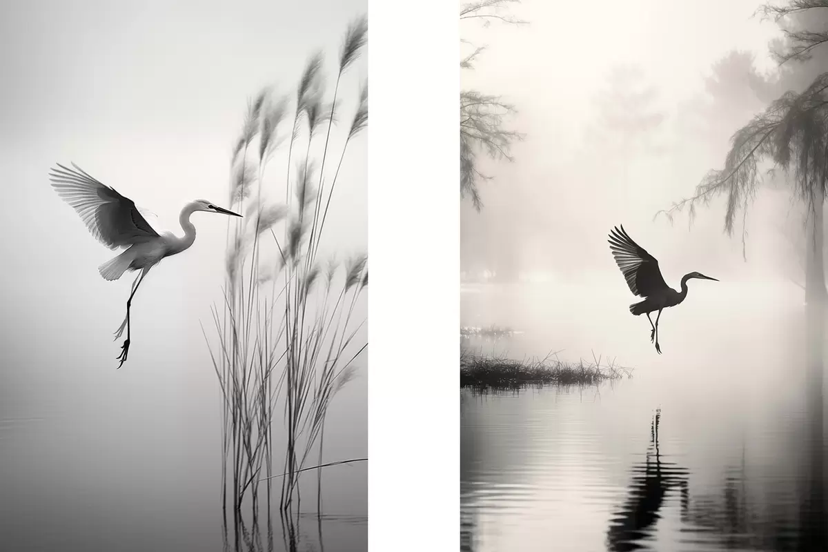Poster Een witte reiger met gespreide vleugels, vliegend in de buurt van hoog riet, zwart-witte minimalistische compositie Nr d01007