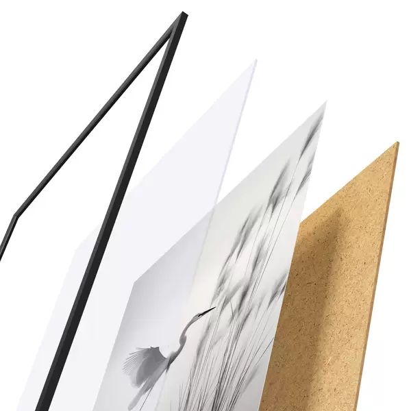 De poster bestaat uit een frame, plexiglas, geprinte afbeelding en spaanplaat achterkant. De poster kan meteen aan de muur worden gehangen dankzij de bevestigingen op de achterkant.