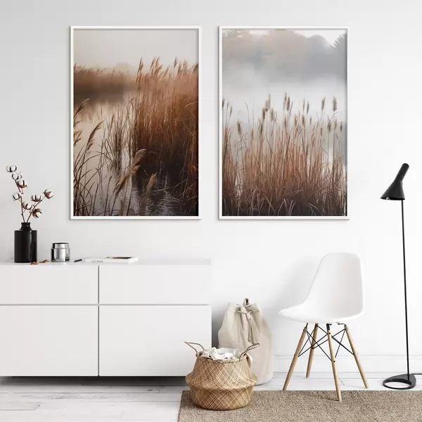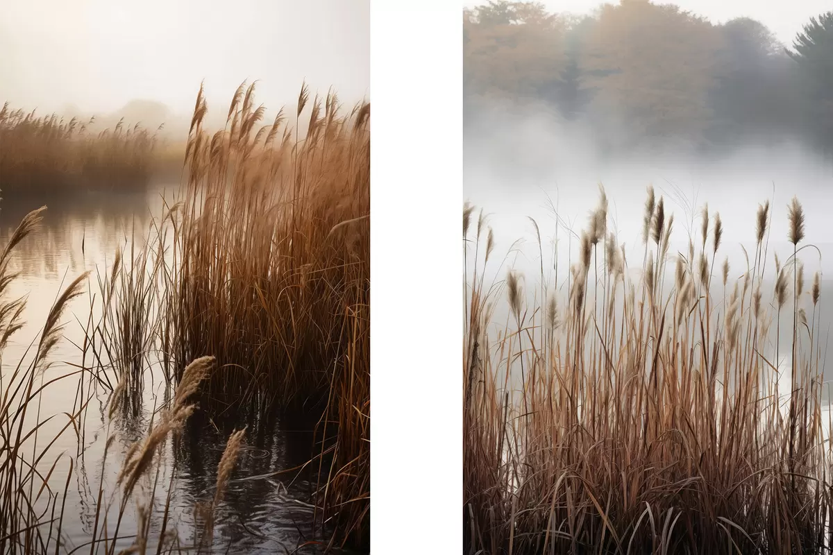 Poster Hoge rietstengels groeien in een watermassa, het water weerspiegelt het riet, mistige achtergrond, zacht licht, natuurtafereel Nr d01008