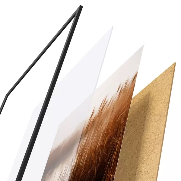 De poster bestaat uit een frame, plexiglas, geprinte afbeelding en spaanplaat achterkant. De poster kan meteen aan de muur worden gehangen dankzij de bevestigingen op de achterkant.