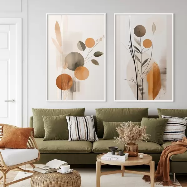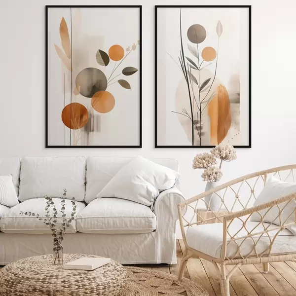 Poster Abstracte schilderijimitatie met oranje en grijze cirkels, bladeren en takken, moderne stijl, aquareleffect Nr d01009