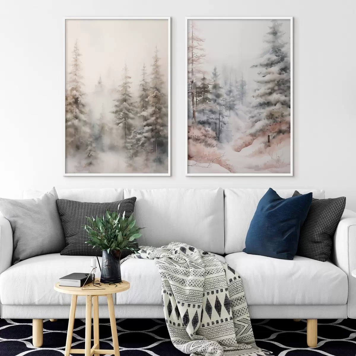 Poster Hoge dennenbomen bedekt met sneeuw, staande in een mistig bos, een zacht, gedempt winters tafereel Nr d01011