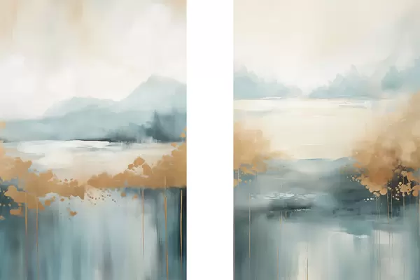 Poster Abstract landschap met bergen en meer in blauwgroen en gestructureerd geel, zachte penseelstreken, minimalistisch kunstwerk Nr d01012