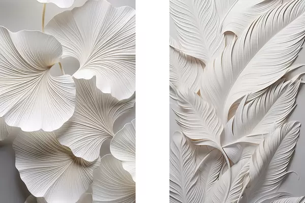 Poster Witte ginkgobladeren en lange bladeren met ingewikkelde details, waardoor een gestructureerd en gelaagd effect ontstaat, minimalistische kunst Nr d01013