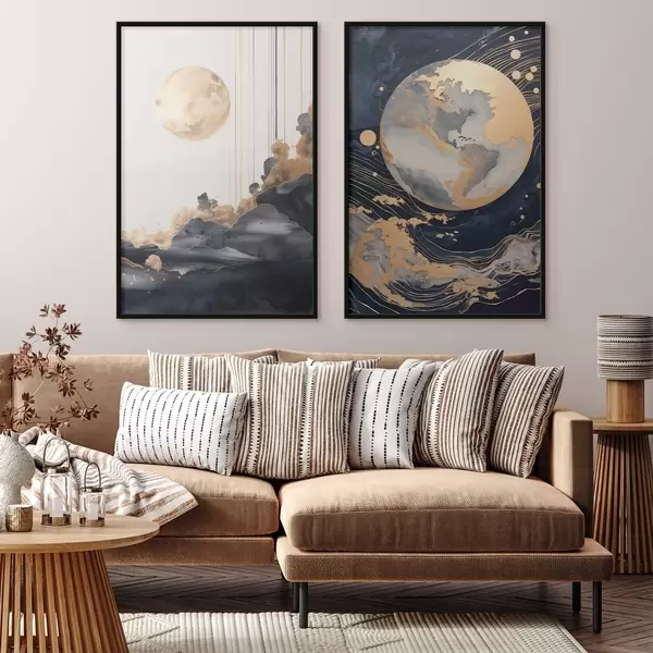 Poster Textuurdecoratieve planeet in de ruimte met gele lijnen en stippen, abstracte stijl, minimalistisch en modern Nr d01014