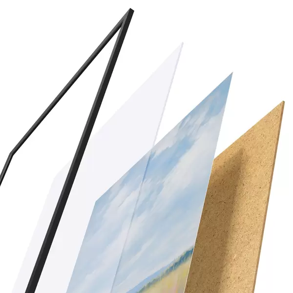 De poster bestaat uit een frame, plexiglas, geprinte afbeelding en spaanplaat achterkant. De poster kan meteen aan de muur worden gehangen dankzij de bevestigingen op de achterkant.