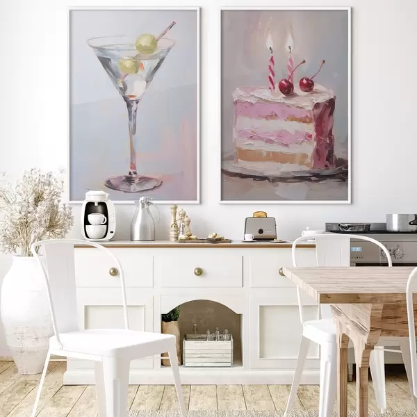 Poster Een glas met een drankje en een stuk taart imitatie schilderij Nr d01019