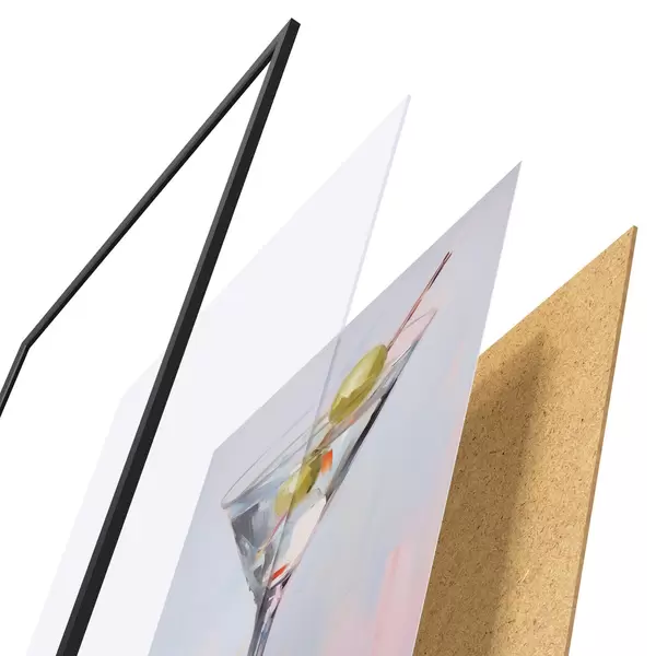 De poster bestaat uit een frame, plexiglas, geprinte afbeelding en spaanplaat achterkant. De poster kan meteen aan de muur worden gehangen dankzij de bevestigingen op de achterkant.