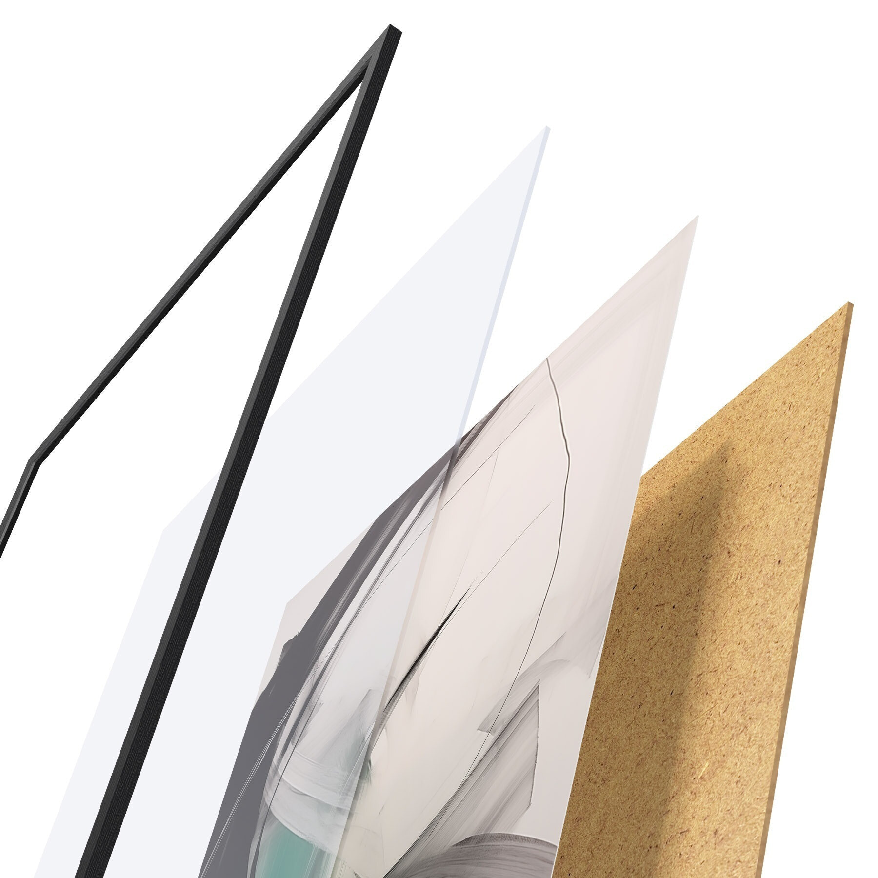 De poster bestaat uit een frame, plexiglas, geprinte afbeelding en spaanplaat achterkant. De poster kan meteen aan de muur worden gehangen dankzij de bevestigingen op de achterkant.