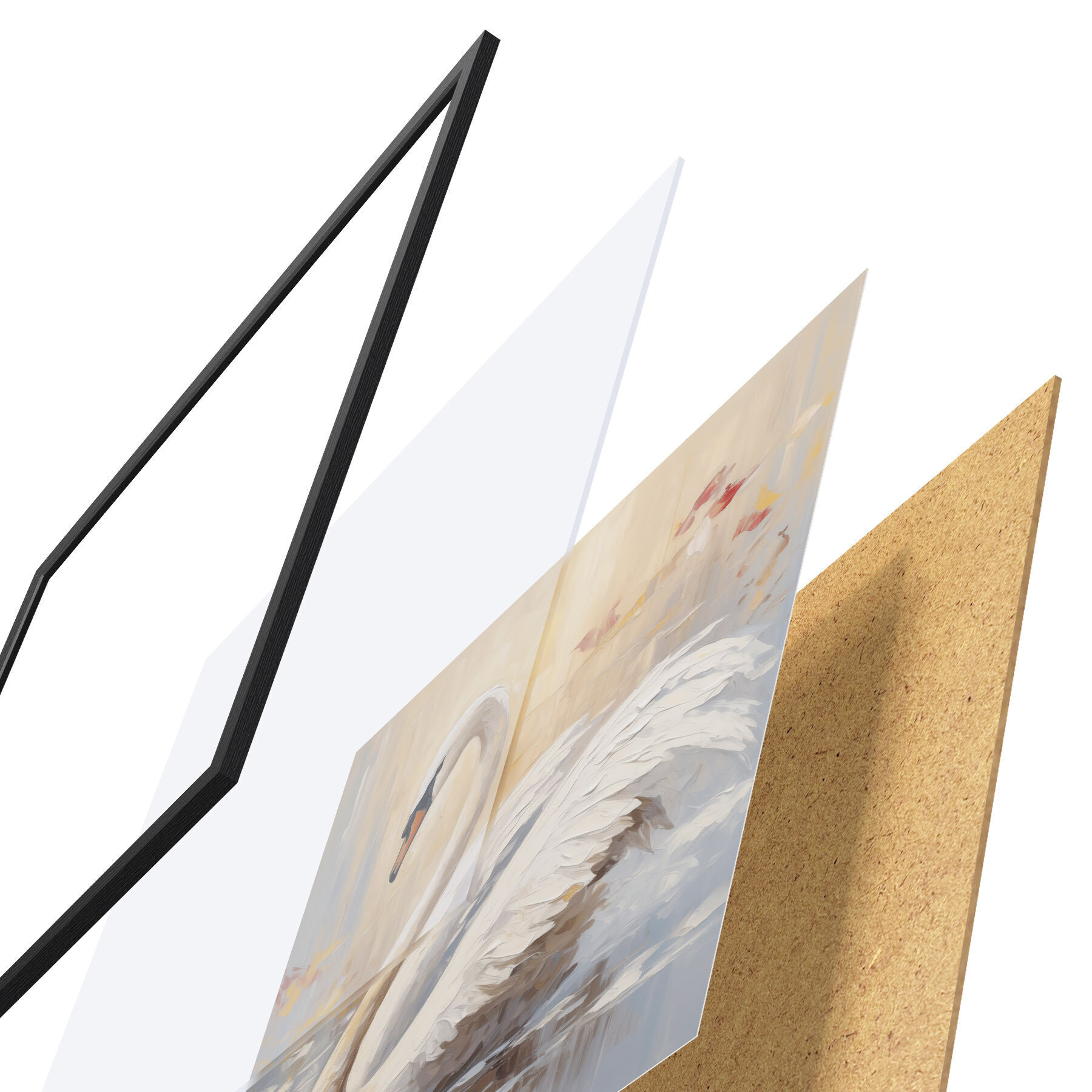 De poster bestaat uit een frame, plexiglas, geprinte afbeelding en spaanplaat achterkant. De poster kan meteen aan de muur worden gehangen dankzij de bevestigingen op de achterkant.