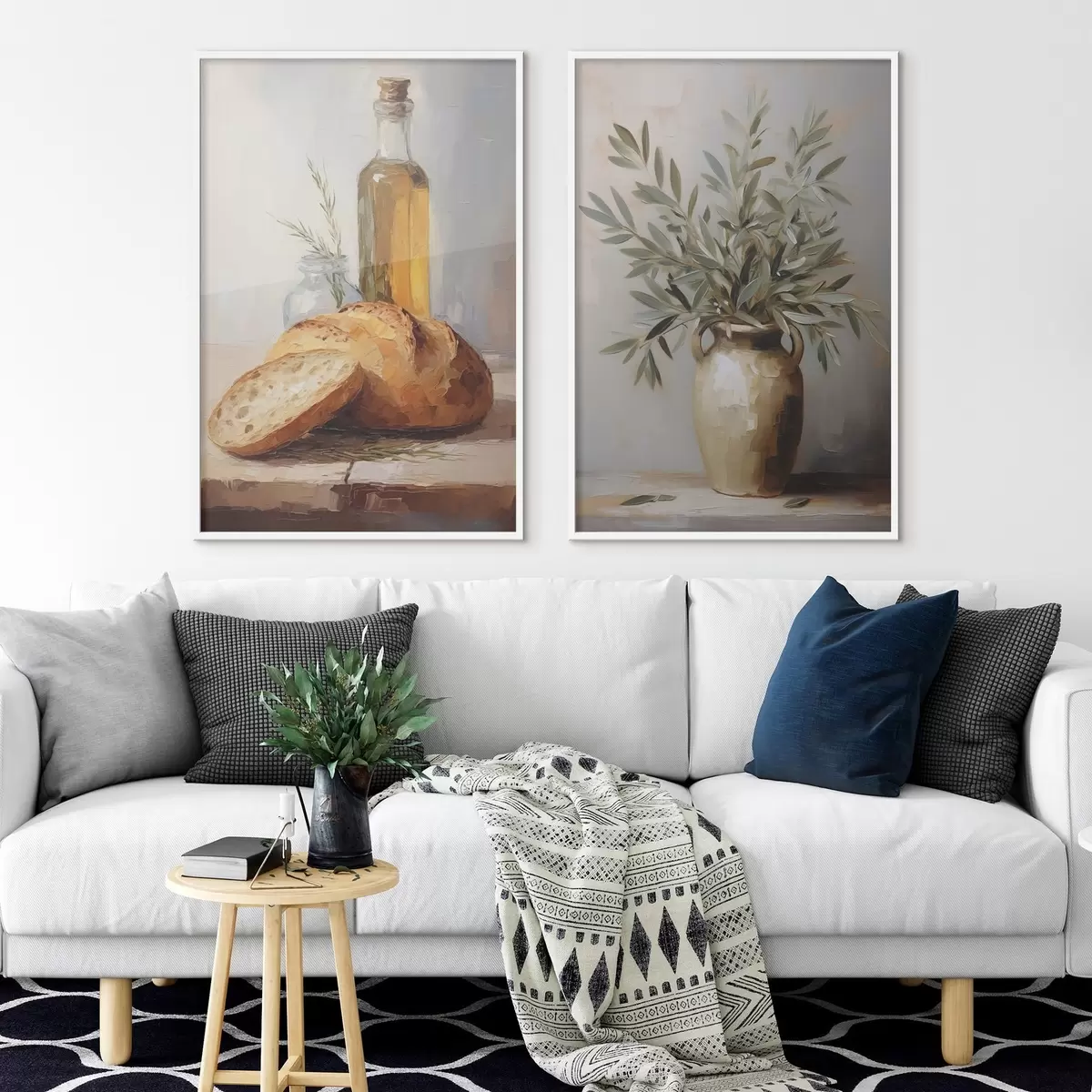 Poster Olijftakken in een vaas, brood en een fles olie, imitatie schilderij Nr d01035
